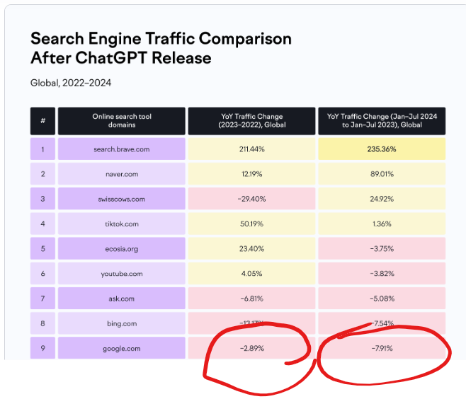 Traditional search engines like Google are feeling the impact according to research done by Semrush. Year-over-year, Google has seen a decline in search traffic, with a drop of nearly 8%, while AI-focused platforms like Brave have grown by over 200%.
